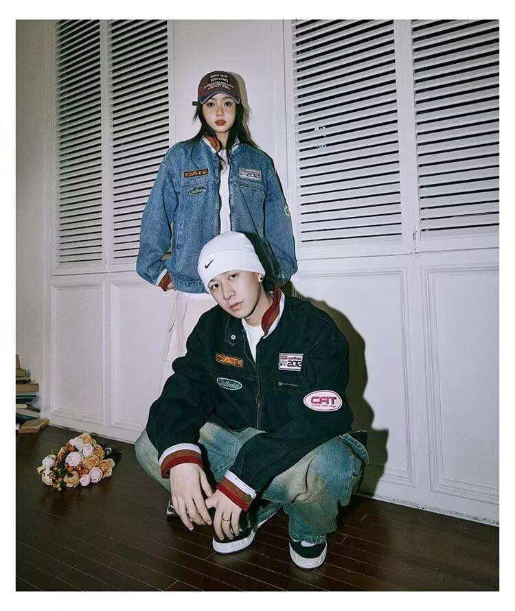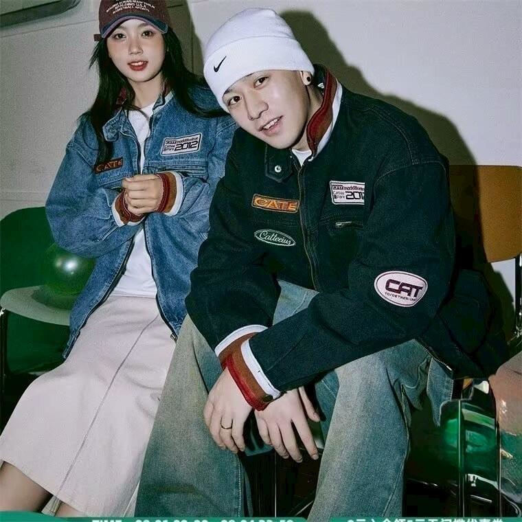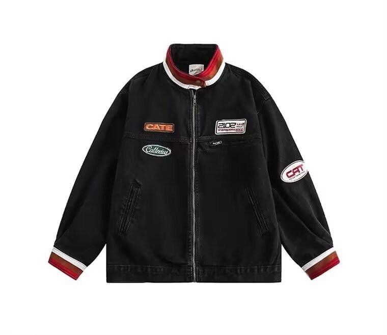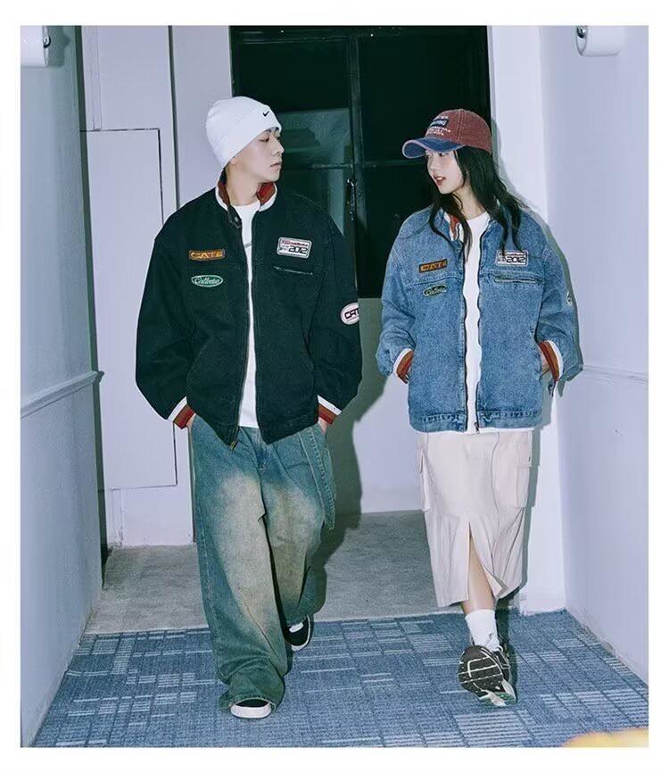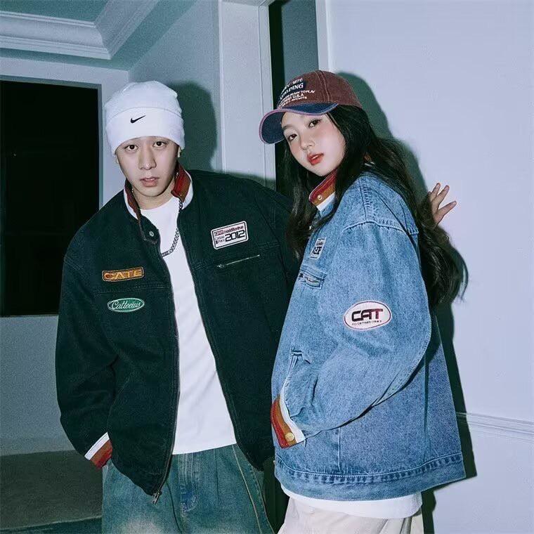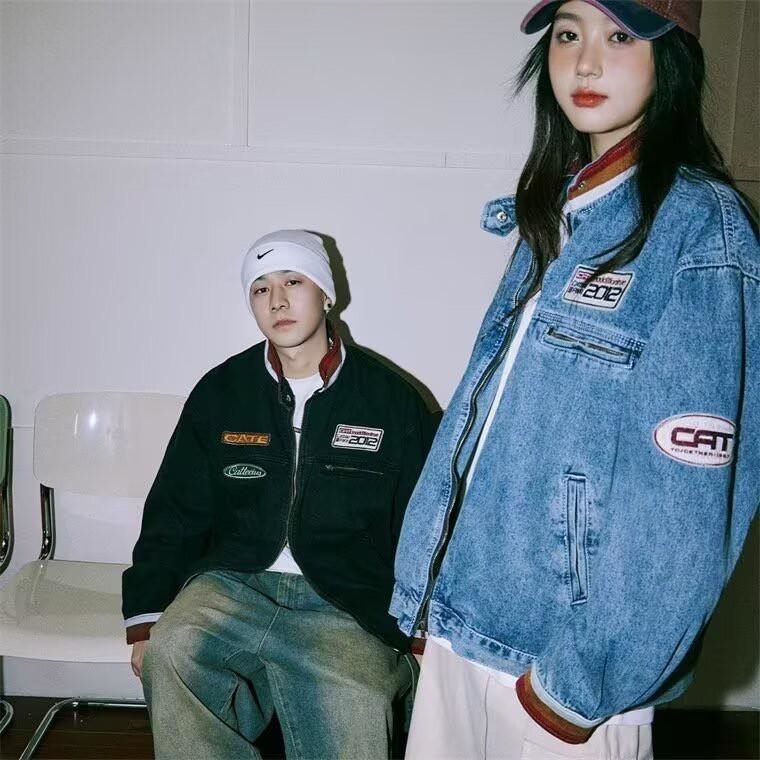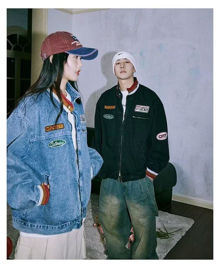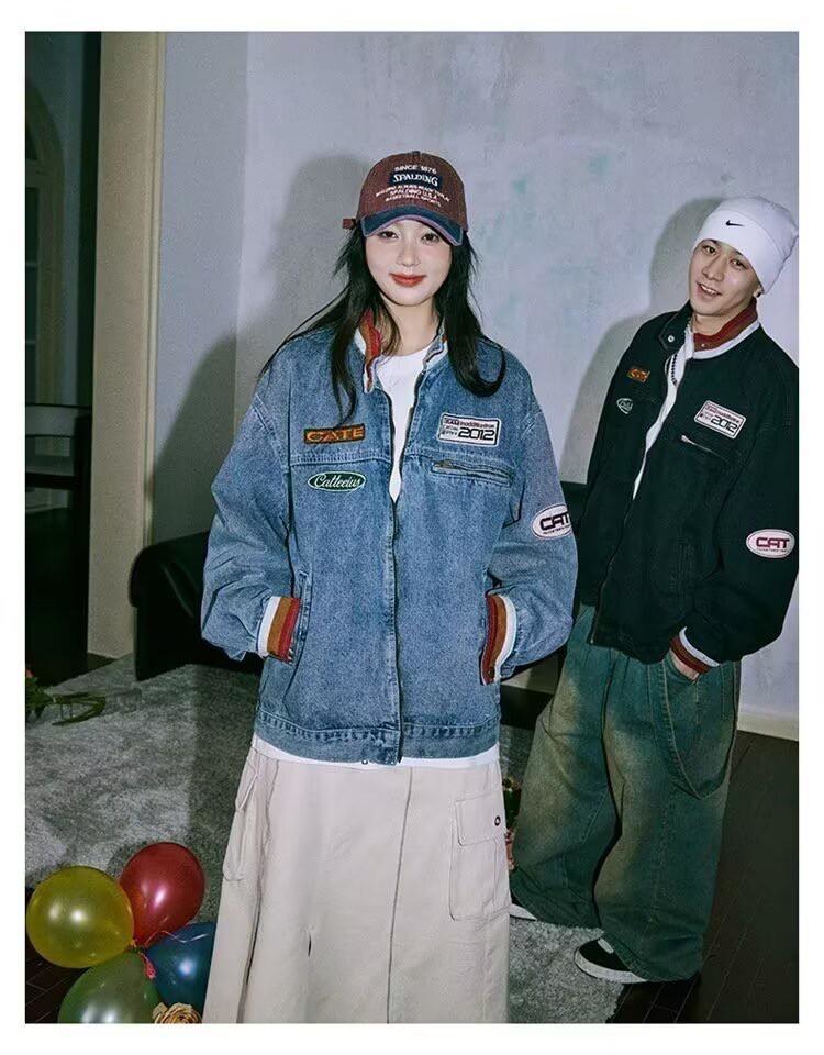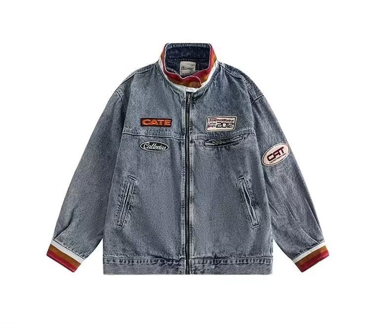 【預購】美式復古撞色拼接立領徽章牛仔夾克